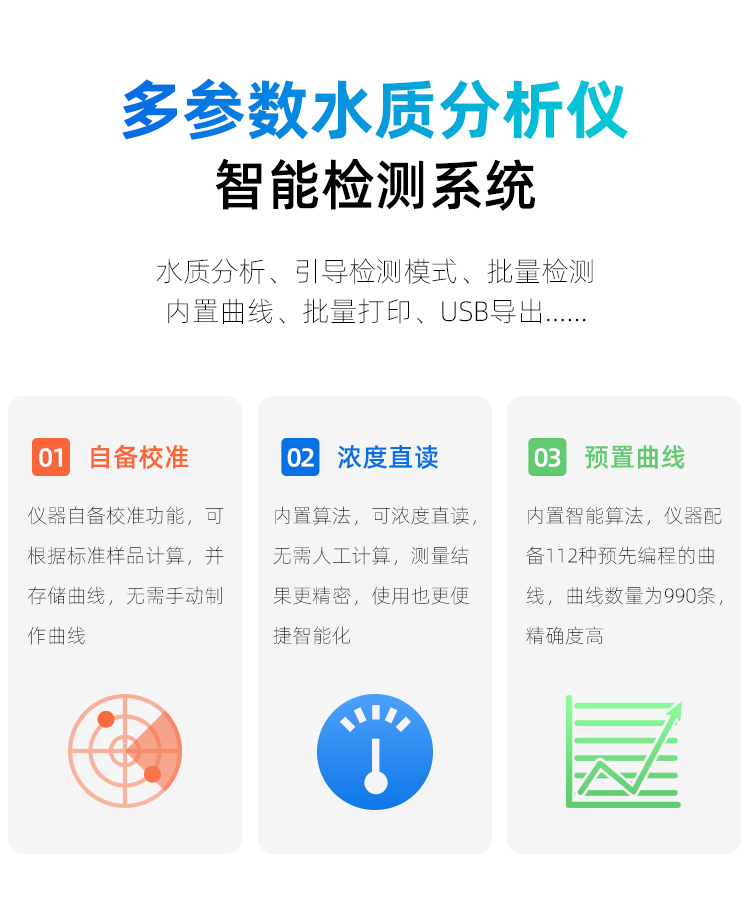 人工智能語(yǔ)音播報(bào)提示,可隨意調(diào)節(jié)音量, 使用更方便更 配備112種預(yù)先編程的曲線,曲線數(shù)量990條,可濃度直讀,測(cè)量結(jié)果更精密; 具有數(shù)據(jù)存儲(chǔ)功能,可存儲(chǔ)90萬(wàn)組數(shù)據(jù),并能自由查看; 10寸彩色液晶顯示觸摸屏,全中文操作模式,更便于操作掌握; 儀器自備校準(zhǔn)功能,可根據(jù)標(biāo)準(zhǔn)樣品計(jì)算, 并存儲(chǔ)曲線,無(wú)需手動(dòng)制作曲線; 配備USB接口傳輸功能,自帶打印機(jī),可打印當(dāng)前數(shù)據(jù)及存儲(chǔ)的歷史數(shù)據(jù); 采用管比色、皿比色,雙比色系統(tǒng)