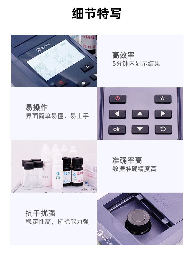 一款適用于工業(yè)污水、水產(chǎn)養(yǎng)殖等領(lǐng)域的檢測(cè)儀,配合檢測(cè)試劑,可“快速、簡(jiǎn)單、準(zhǔn)確、穩(wěn)定”進(jìn)行測(cè)量,擁有精美的外觀造型,簡(jiǎn)單的操作界面,準(zhǔn)確的檢測(cè)系統(tǒng),幫助用戶獲得精細(xì)的數(shù)據(jù),可更準(zhǔn)確、有效的分析水體狀況,提前預(yù)防養(yǎng)殖風(fēng)險(xiǎn),及時(shí)避免損失。 數(shù)據(jù)準(zhǔn)確,攜帶方便,檢測(cè)快速,操作簡(jiǎn)單